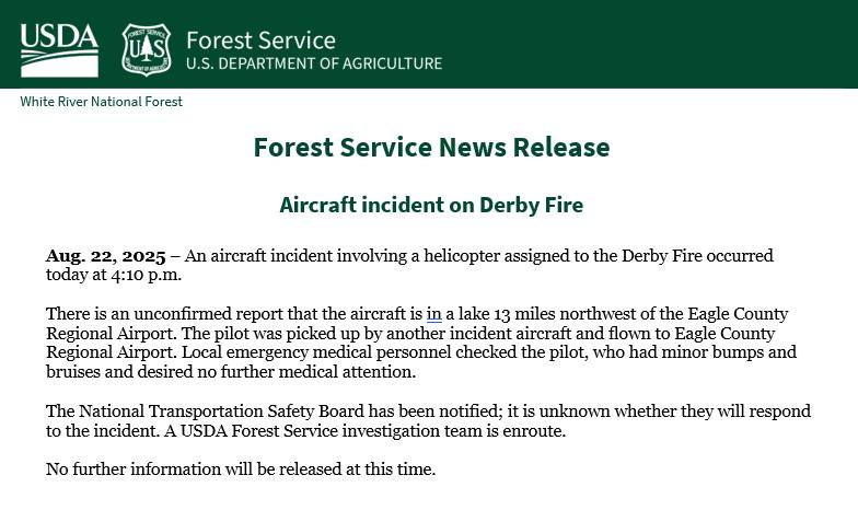 EAGLE COUNTY, Colo. — A helicopter working on the Derby Fire was involved in an incident Friday afternoon, according to the U.S. Forest Service.